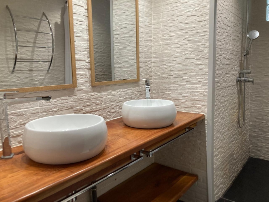 Accessible de plain-pied malgré sa situation en R+1, il se compose de deux grandes chambres climatisées avec rangements intégrés, d’une cuisine aménagée et équipée, d’un séjour lumineux, d’une arrière-cuisine spacieuse . La salle d’eau est moderne, avec double vasque.