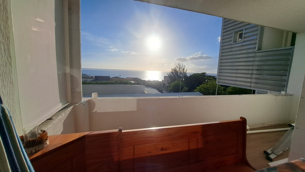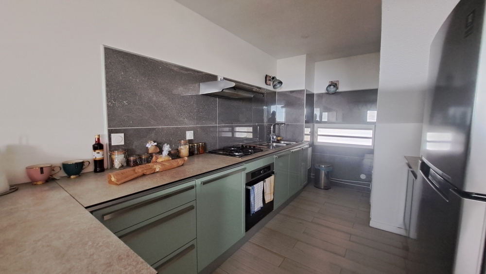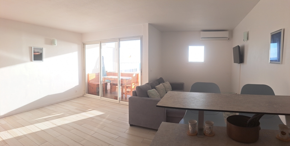 Niveau principal : un salon-séjour spacieux lumineux, idéal pour créer un espace de vie convivial, un dégagement aménagé en coin bureau, une cuisine ouverte sur le séjour, un balcon avec vue mer.