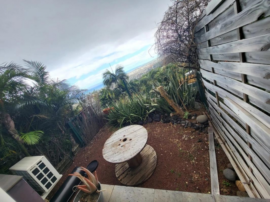 Il comprend : une pièce principale climatisée et avec placards donnant sur une varangue couverte, une cuisine équipée (placards, plaques, frigo GM), une salle d'eau avec WC et un jardin privatif de 11m² avec vue mer.