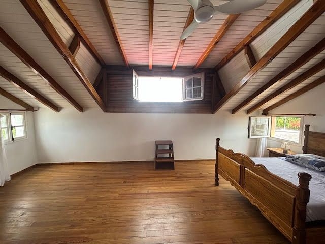 Il se compose d'une pièce de vie salon/séjour avec sa cuisine aménagée et équipée, une salle d'eau avec wc et une cour privative d'environ 20m². A l'étage une grande chambre climatisée d'environ 26m².