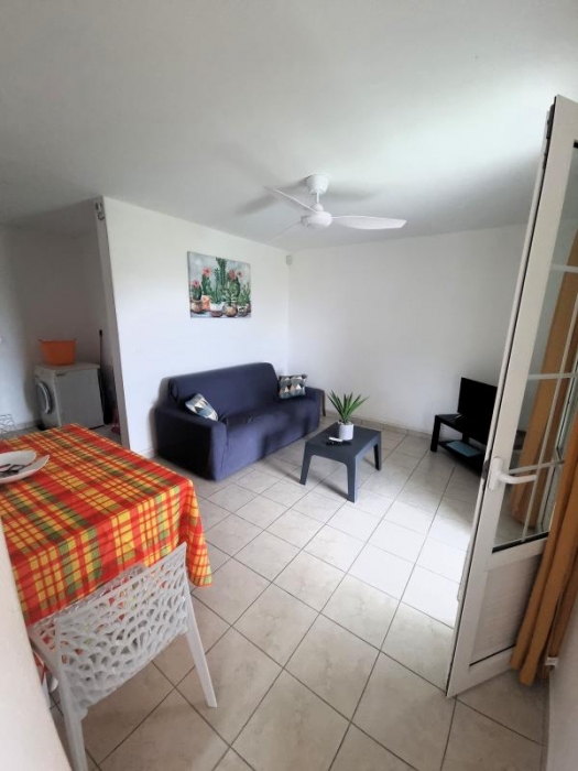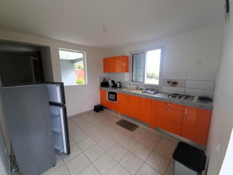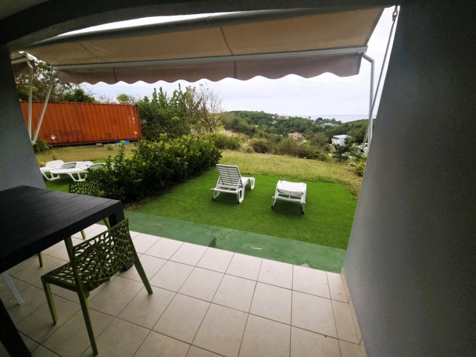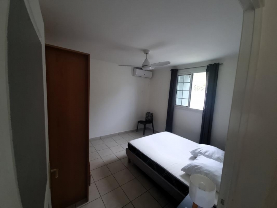 Appartement en bas de villa mitoyen de type T3 avec vue sur mer, composée d'un séjour avec brasseur d'air avec une cuisine aménagée et équipée, deux chambres climatisées avec brasseurs d'air, une salle d'eau avec wc, une terrasse couverte, un emplacement de parking, citerne tampon et citerne eau de pluie. Eau, électricité et entretien du jardin compris dans le loyer.