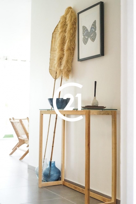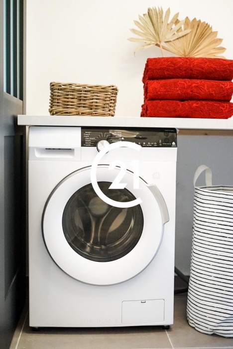La cuisine indépendante, aménagée et équipée, est un véritable atout pour les amateurs de gastronomie. Les ouvertures en aluminium et les portes à simple vitrage apportent une touche moderne et lumineuse à l'ensemble.
