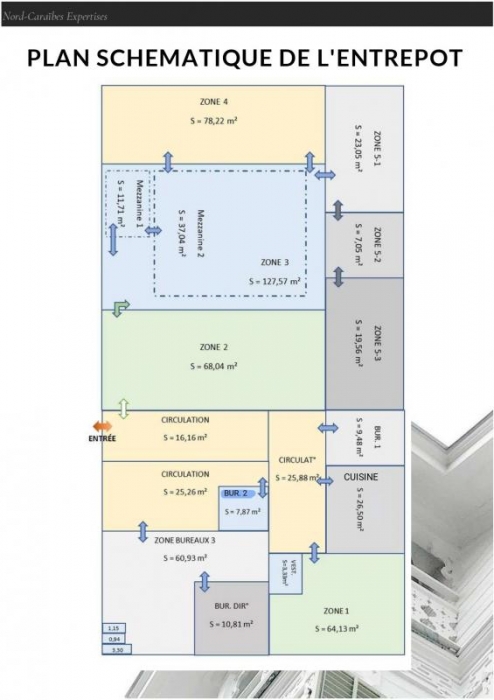 L'ensemble comprend des bureaux d'environs 89m², d'un entrepôt de 387 m² divisé en plusieurs zone et une mezzanine de 48 m² offrant un espace de rangement supplémentaire.
