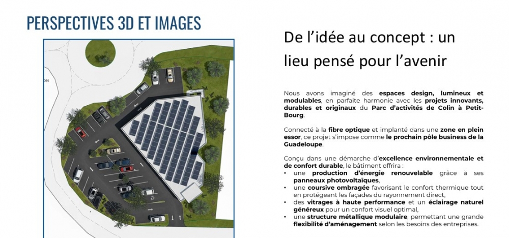 Implanté au cœur de la Guadeloupe, dans le Parc d’activités de Colin à Petit-Bourg, ce futur immeuble tertiaire bénéficie d’un emplacement stratégique à proximité immédiate des axes reliant Basse-Terre, Jarry et Pointe-à-Pitre. Un site central, accessible et dynamique, idéal pour les entreprises en développement.