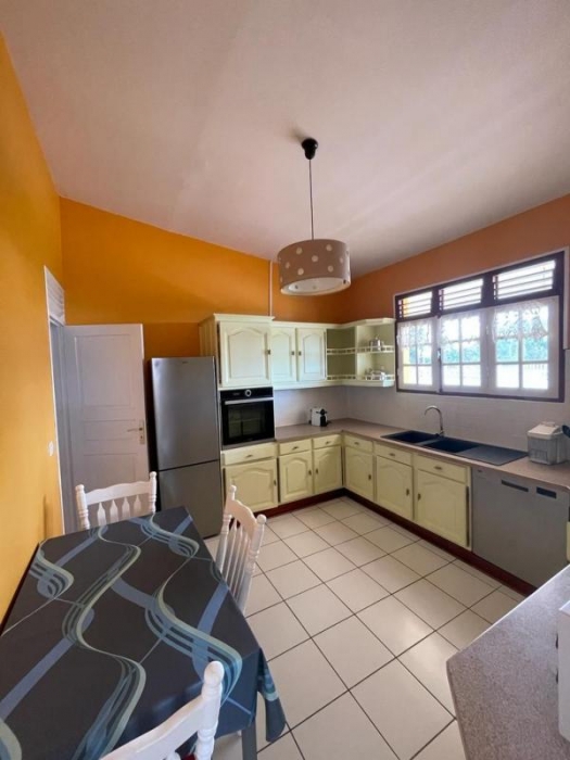 Une cuisine aménagée équipée . Un séjour et une salle à manger en L, offrant un espace convivial et lumineux.