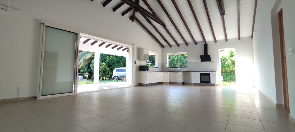 D'une superficie d'environ 100 m2, elle comprend très grand espace de vie, salon et cuisine ouverte aménagée, trois chambres climatisées avec placards dont une suite parentale attenante à sa salle d'eau avec toilette intégré et grand placard, une salle d'eau supplémentaire indépendante, deux toilettes indépendants dont un extérieur, une grande terrasse et un jardin cloturé.