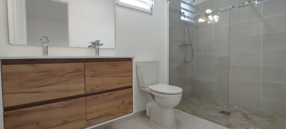 D'une surface habitable d'environ 89 m2 , elle comprend: un salon spacieux ouvert sur une belle cuisine aménagée, un cellier de rangement équipé d'un emplacement pour une machine à laver, une suite parentale climatisée avec un coin dressing aménagé d'une armoire à glace et une salle d'eau attenante avec toilette intégré, deux chambres climatisées supplémentaires, une salle d'eau avec toilette intégré et un toilette indépendant. L'extérieur est composé d'une terrasse couverte donnant sur un jardin plat piscinable et de plusieurs emplacements de stationnement.