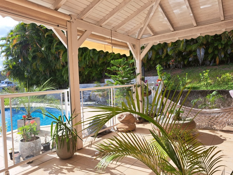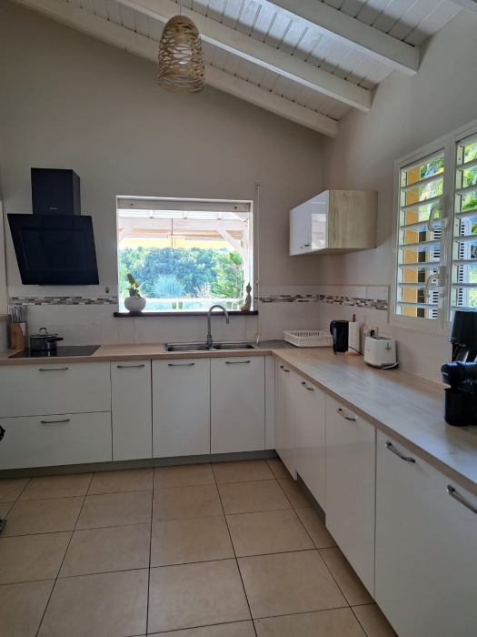 BELLE VILLA MODERNE ET BIEN EQUIPEE, DE TYPE F5 MEUBLEE, EDIFIEE SUR UN TERRAIN ARBORE ET BIEN SITUEE A PETIT BOURG, SANS VIS-A-VIS DIRECT, AVEC PISCINE COMPRENANT UN SEJOUR CLIMATISE, UNE CUISINE EQUIPEE (réfrigérateur-congélateur, plaque de cuisson, four, hotte, micro-ondes, lave-vaisselle, lave-linge et sèche-linge), UN CELLIER, QUATRE CHAMBRES CLIMATISEES, DEUX SALLES D'EAU, UN WC INDEPENDANT, UN DRESSING, UNE TERRASSE, UNE PISCINE ET UN SALON EXTERIEUR ENTERRE.