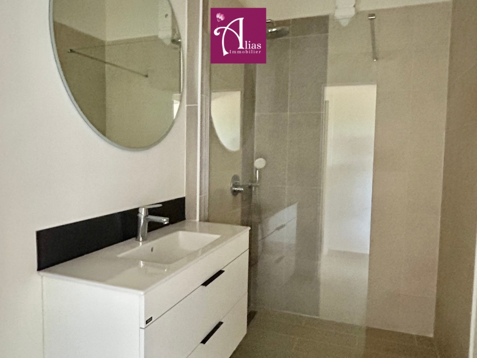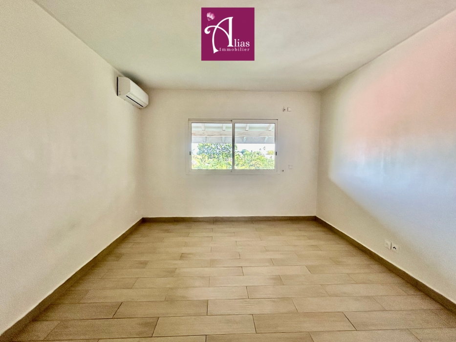 Vous trouverez un séjour lumineux ouvert sur une cuisine équipée (avec plaque de cuisson 4 feux) et aménagée donnant sur une terrasse couverte de 31m2 offrant une belle vue dégagée. Vous trouverez également un WC indépendant, une grande suite parentale climatisée de 25,60 m2 avec dressing et salle d’eau attenante avec un WC.