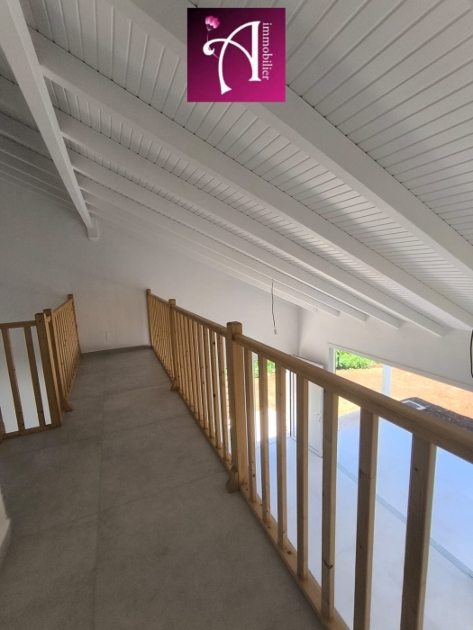 La maison se compose d'un séjour lumineux avec de grandes baies vitrées ouvrant sur la terrasse, ainsi que d'une cuisine semi-équipée avec meubles de rangement. Un cellier attenant vient compléter cet espace pratique et convivial.