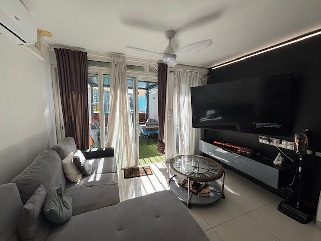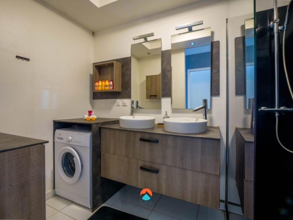 Elle se compose d'une entrée, d'une cuisine aménagée et entièrement équipée ouverte sur la grande pièce de vie salon/séjour climatisée.