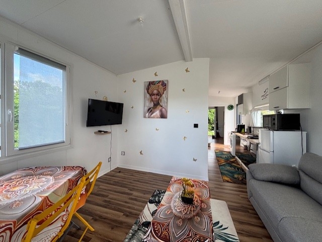 Entrez par un séjour équipé, puis dirigez-vous vers le coin cuisine qui vous mènera à un bureau climatisé, une salle d'eau avec toilettes et une chambre avec son accès à une terrasse privative.