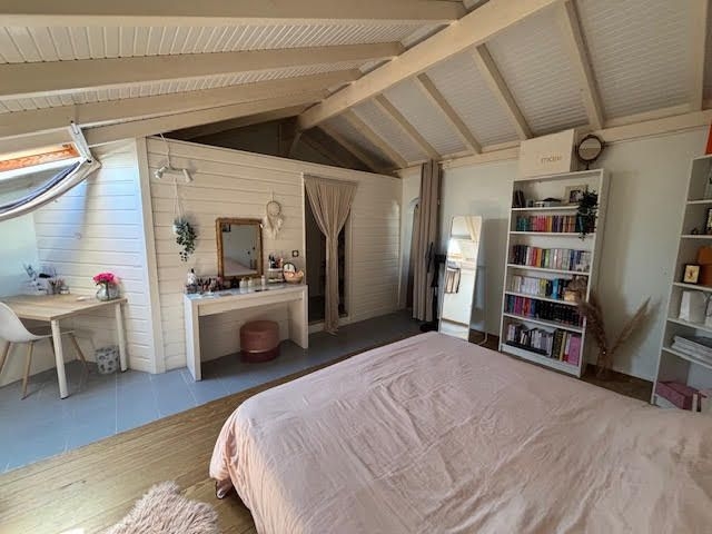 L'autre escalier vous accompagne à une troisième chambre parentale climatisée avec une vue mer magnifique sur le lagon et sa salle d'eau/wc ainsi qu'à une spacieuse mezzanine aménagée en quatrième chambre avec son bureau et un brasseur d'air.