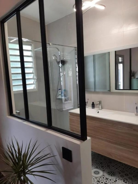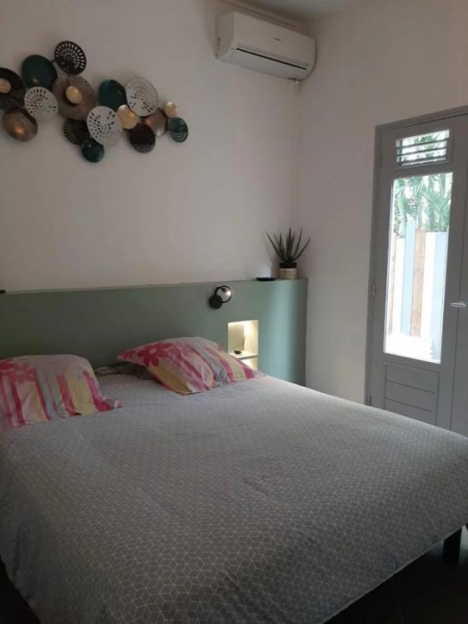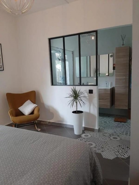 Villa T4 meublée 140m² habitable comprenant : 1 cuisine aménagée et entièrement équipée avec ilôt central donnant sur 1 séjour, grande mezzanine avec rangement, 3 chambres climatisées dont 1 chambre parentale avec sa salle d'eau, 1 dégagement avec placard, 1 salle d'eau avec placard intégré et wc, 1 wc indépendant, 1 cellier, 1 dressing, 1 grande terrasse avec deck tout autour de la maison, petite piscine, jardin clôturé de 400m².