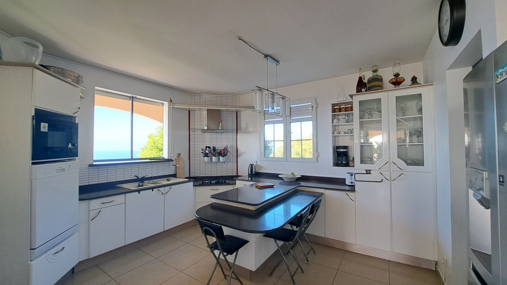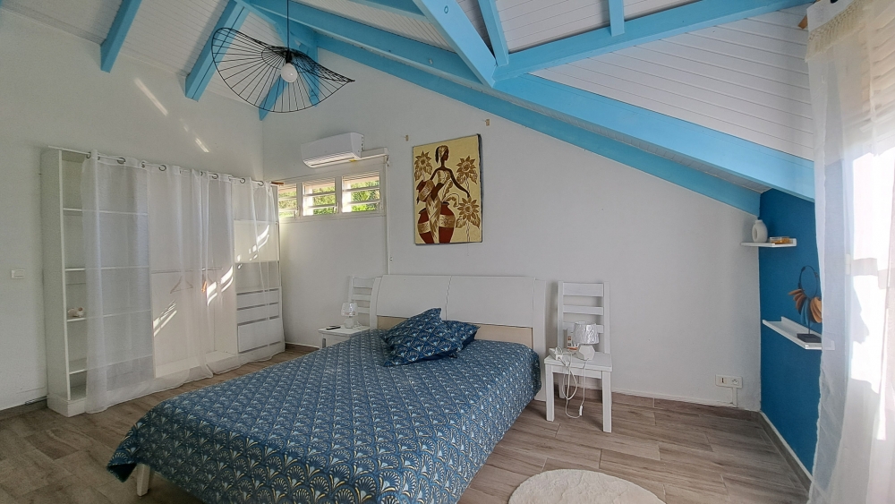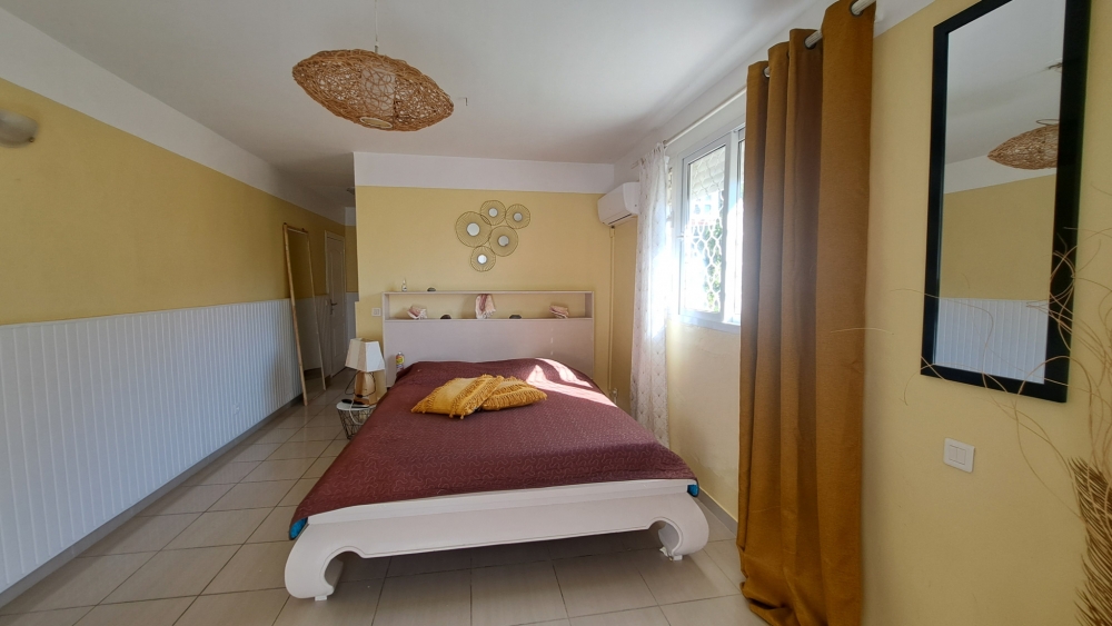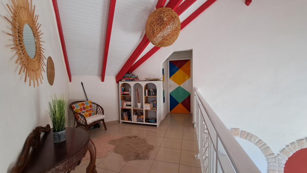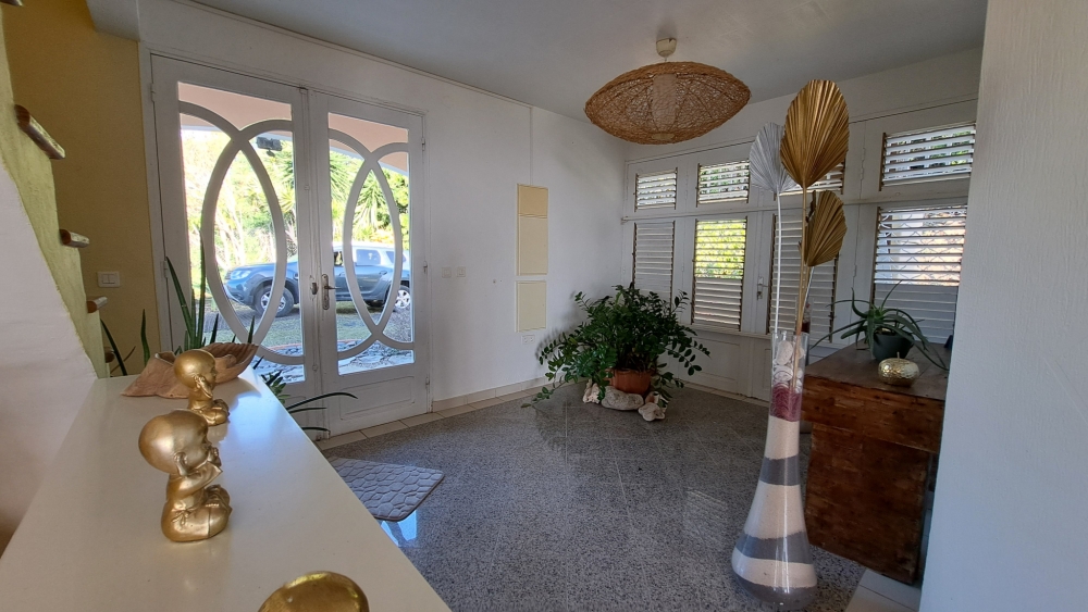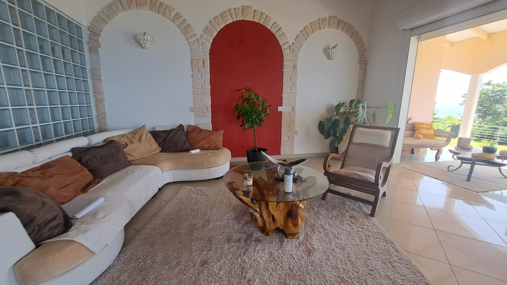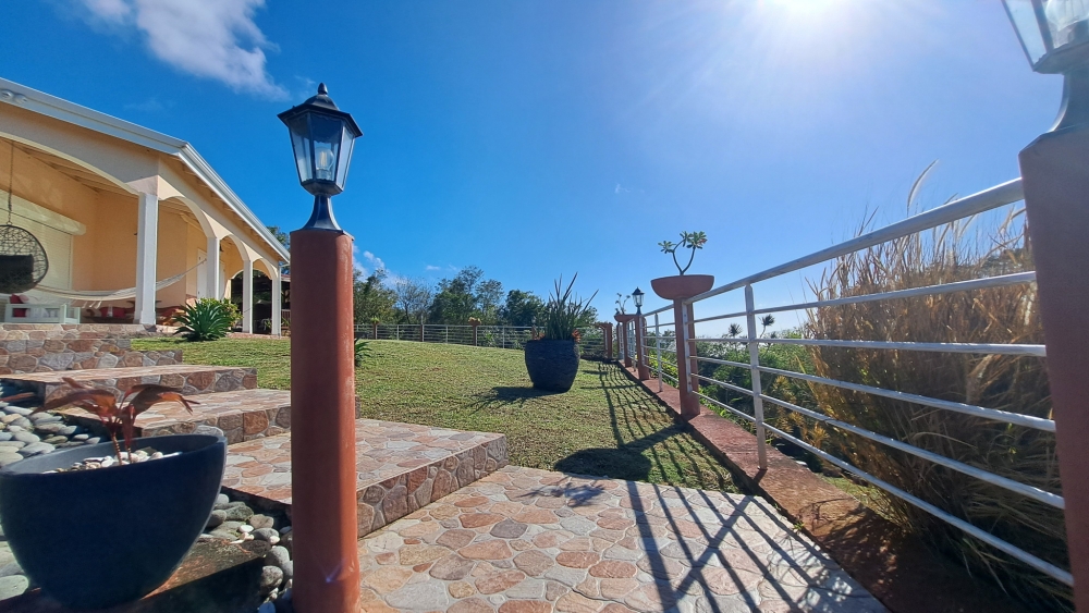 Découvrez cette superbe villa familiale répartie sur trois niveaux, offrant de très beaux volumes, avec un grand jardin entièrement clôturé et une vue mer dégagée sur l'archipel des Saintes. Cette villa comprend :