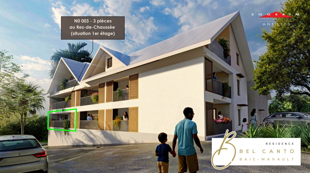 Découvrez les volumes généreux et l'élégance de cet appartement 3 pièces, situé au Rez-de-Chaussée (élévation 1er étage), de la résidence de standing privé 'Bel Canto' à Destrellan, Baie-Mahault.