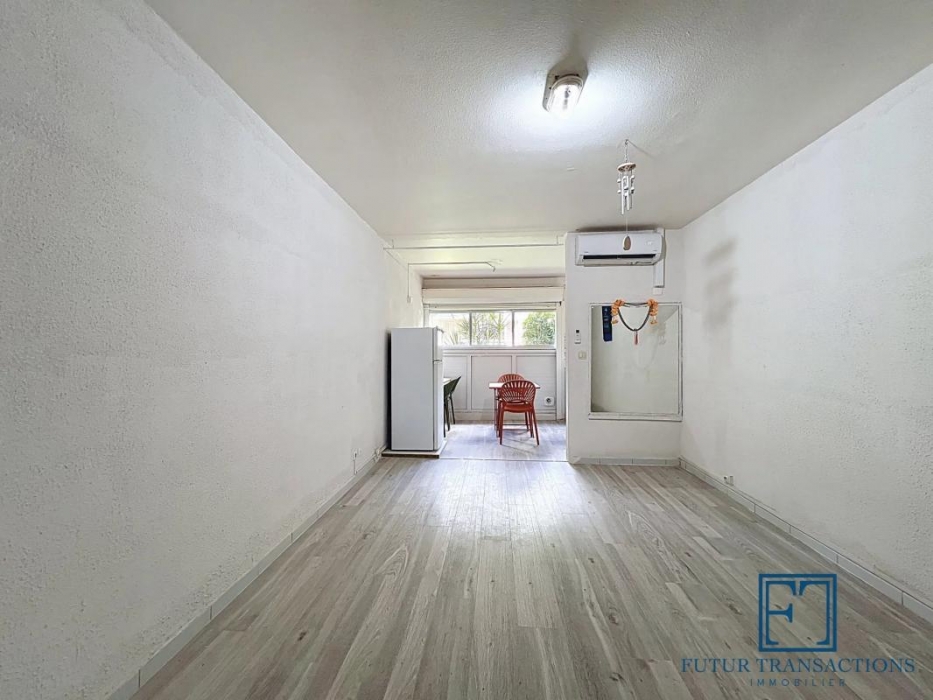 Ce T1 de 29 m², en rez-de-chaussée côté jardin, propose une entrée avec rangement, une pièce de vie climatisée avec revêtement parquet, un coin cuisine aménagé, ainsi qu'une salle d'eau rénovée avec meuble vasque, douche à l'italienne et WC.