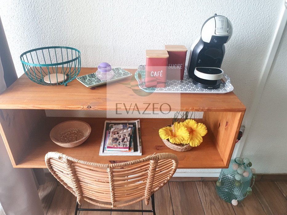 Cuisine équipée : Frigo, micro-ondes, cafetière, plaque électrique, évier, vaisselle complète