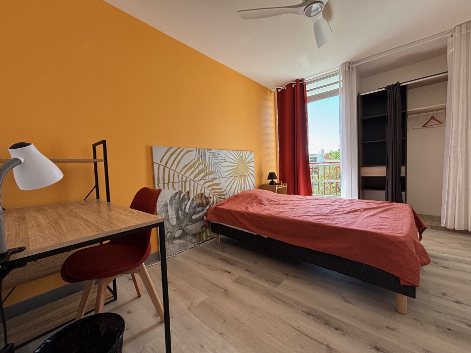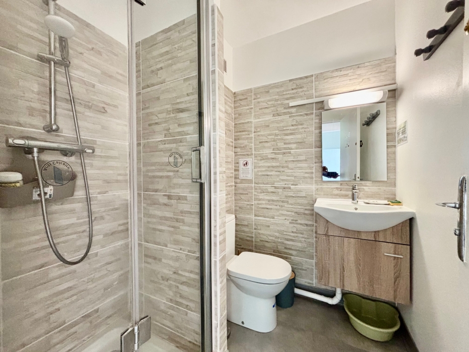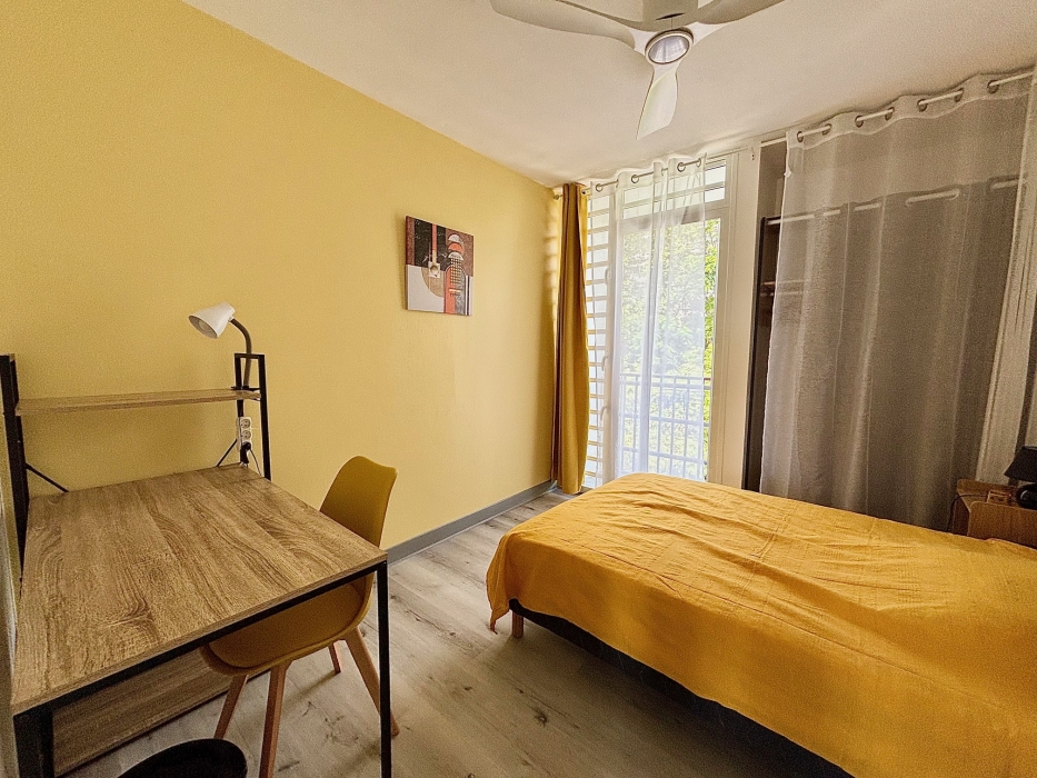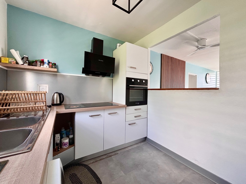 L’entrée s’ouvre sur un séjour lumineu et conviviale. La cuisine, entièrement équipée, offre des espaces de rangement fonctionnels et un accès direct à un cellier très pratique pour le quotidien. Le séjour donne accès également à une chambre et un balcon, idéal pour profiter de l’extérieur.