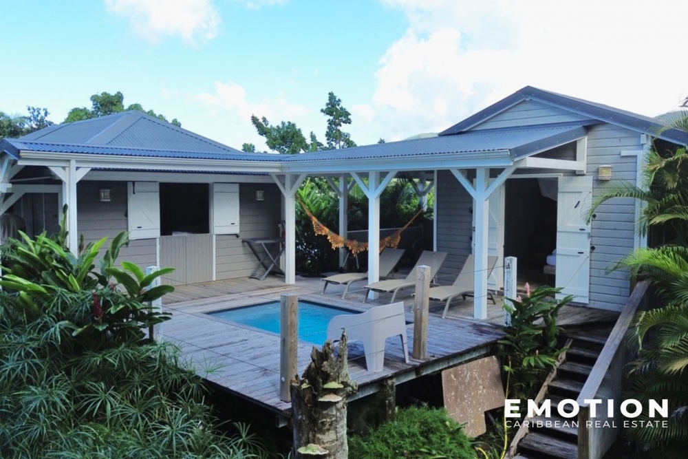 Le Cabinet Emotion Real Estate Guadeloupe vous présente à la vente un lot de 5 gîtes indépendants avec vue mer et vue montagne. La situation géographique du bien vous permet d’éviter d’être niché en pleine nature sans aucun vis à vis dans un environnement rempli de verdure calame et reposant. Situé à 10 minutes de plage de malendure à Bouillante. GÎTE no1 : La Belle Etoile Le gîte de la Belle étoile peut accueillir 4 personnes ou 6 personnes lorsqu'elle est combinée avec la Discrète. Le gîte de la belle étoile offre 2 grandes chambres climatisées, meublées en style créole, 2 salles de douches. Une grande terrasse, un salon confortable, une salle à manger pouvant accueillir 6 personnes et sa cuisine équipée. Un Deck et une piscine 2x3. Une vue spectaculaire sur la mer des Caraïbes et la montagne de Basse - Terre d'où émane une sérénité absolue. GÎTE no2 : Le Bois Dormant Le Bois Dormant saura vous séduire. De votre terrasse, vous découvrirez le panorama d'une vallée dominant le bleu de la mer caraïbe, avec, au loin l'île de Montserrat. À l'est, s'élèvent les arbres majestueux de la forêt tropicale.