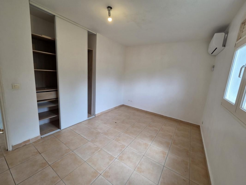 une terrasse, une cuisine ouverte sur le salon, deux chambres avec placards intégrés, une salle de douche et wc séparé.