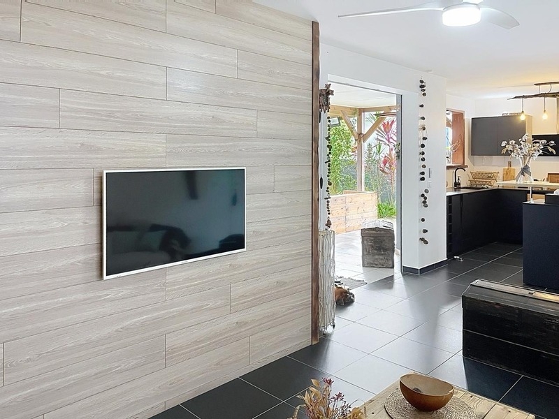 On aime le style contemporain de cette villa bâtie en 2021, où carrelage noir et touches de bois s'accordent avec élégance.