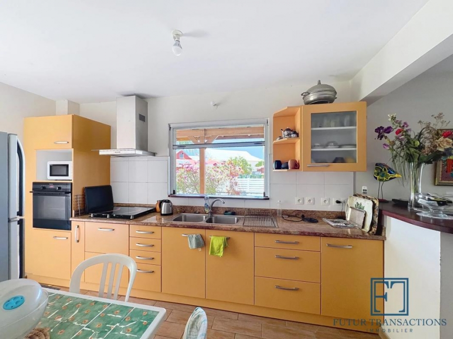 Une cuisine aménagée/équipée avec cellier, ouverte sur séjour lumineux de 32 m² et terrasse couverte de 30 m².