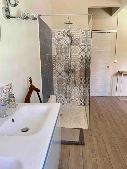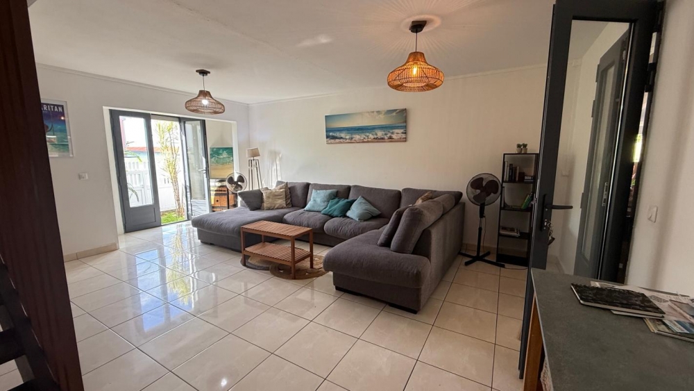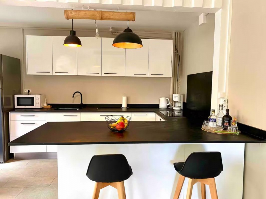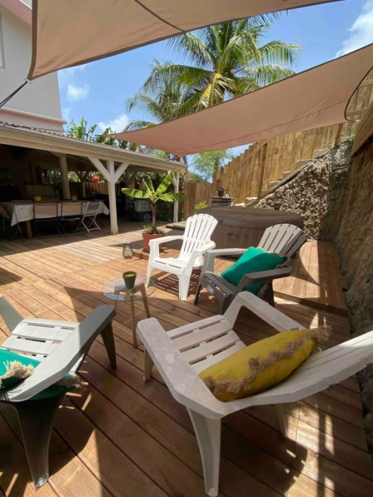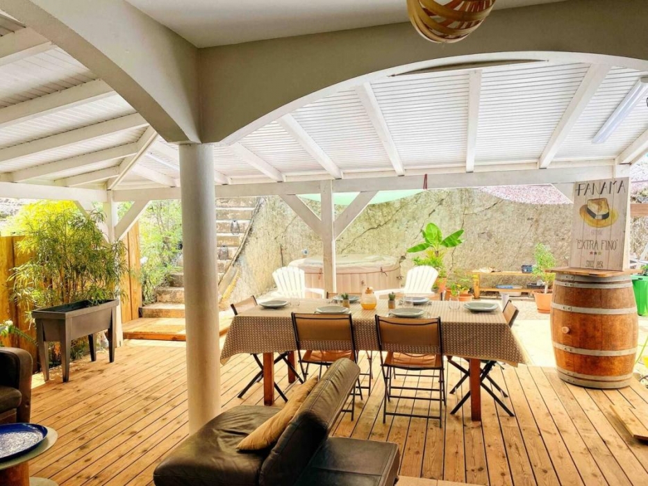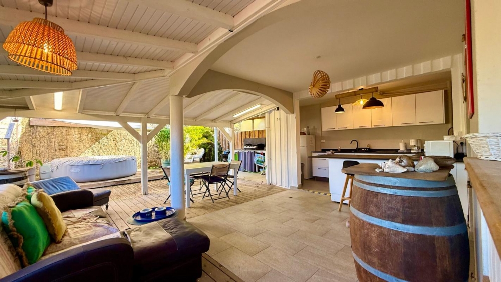 L'espace de vie, lumineux et convivial, s'ouvre sur une spacieuse terrasse parfaitement aménagée, véritable lieu de détente et de réception. Celle-ci dispose d'une cuisine entièrement aménagée et équipée, d'un coin barbecue et d'un jacuzzi, idéal pour profiter pleinement des beaux jours dans une atmosphère chaleureuse et élégante.