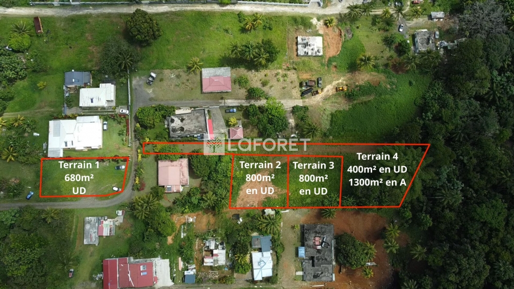L' Agence Laforêt de Baie-Mahault vous propose ces quatre terrains plats situés dans un secteur recherché du Lamentin. L'environnement est calme, bien desservi et proche des commodités, offrant un cadre de vie agréable et pratique. La viabilisation est à proximité immédiate, garantissant un démarrage rapide des travaux. Trois des terrains, d'une superficie de 680 m², 800 m² et 800 m², sont situés en zone UD, entièrement constructible, idéale pour des habitations individuelles. Le quatrième terrain, d'une surface totale de 1700 m², se compose de 400 m² en zone UD et de 1300 m² en zone A, permettant d'allier construction et espace naturel. Chaque terrain est proposé au prix de 154 000 euros. En résumé, ces terrains offrent une excellente opportunité pour concrétiser votre projet immobilier, que ce soit pour une résidence principale, un investissement ou un projet familial. Si vous souhaitez obtenir plus d'informations, contactez votre agence Laforêt immobilier de Baie-Mahault au xx-xx-xx-xx-xx. Les informations sur les risques auxquels ce bien est exposé sont disponibles sur le site Géorisques : www.georisques.gouv.fr Olivier MAZAUD (EI) Agent Commercial - Numéro RSAC : 502830094 - PAP.