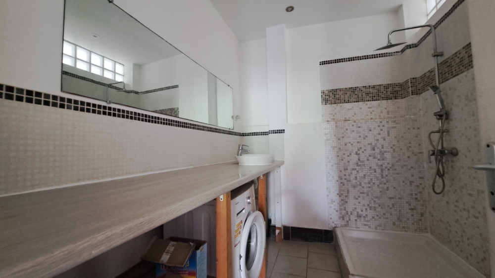 À l’étage, une mezzanine avec salle d’eau complète ce bien et offre une surface supplémentaire, idéale pour un espace bureau, une chambre d’appoint ou un coin polyvalent.