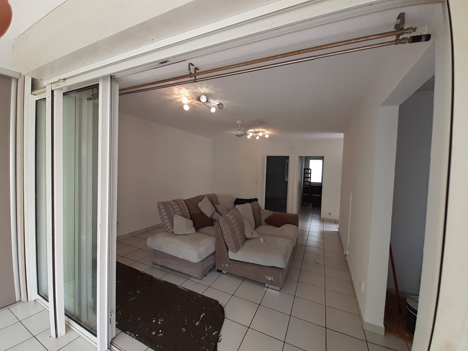 Intérieur : Une entrée , une cuisine aménagée avec plaque de cuisson, hotte et meubles de rangement , un séjour lumineux , deux chambres climatisées avec placards et une salle d’eau avec WC