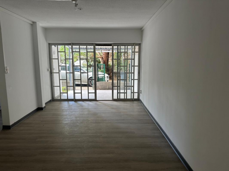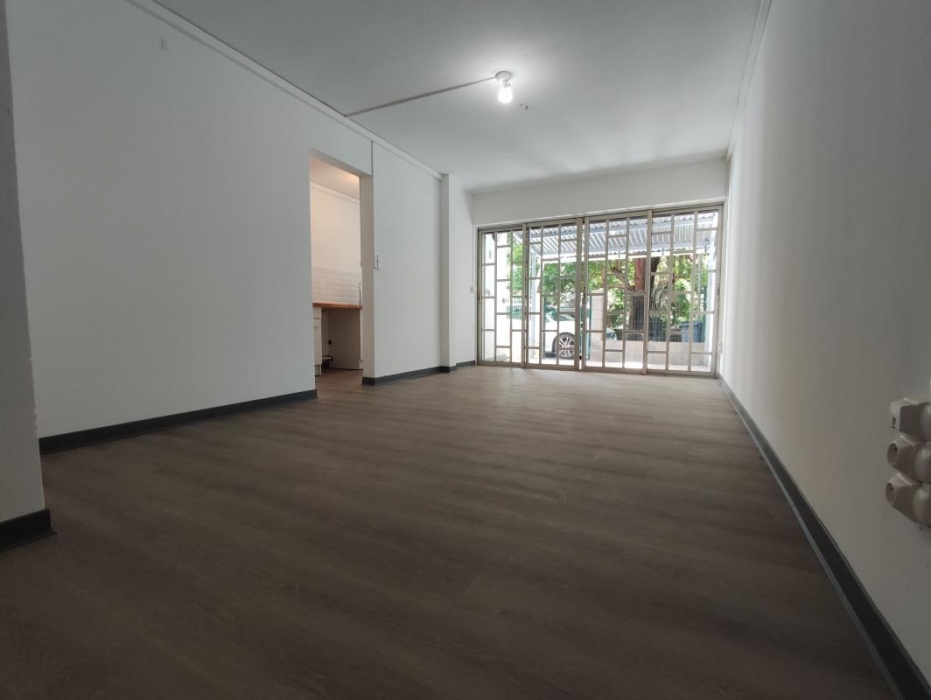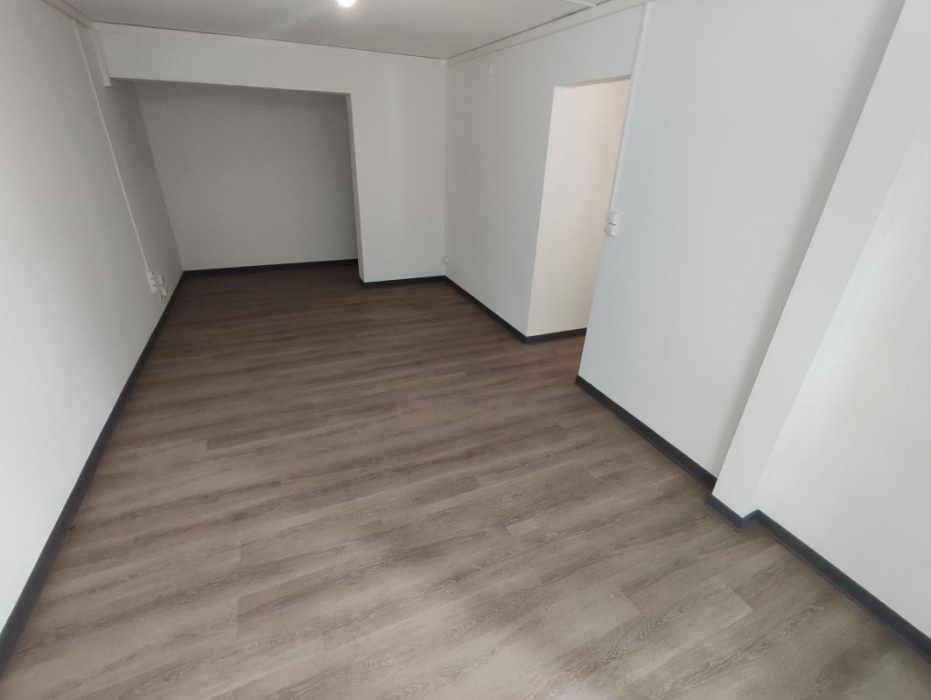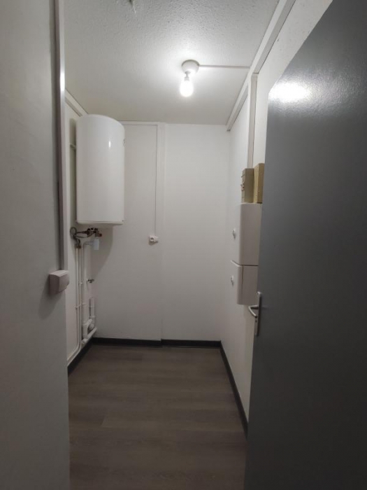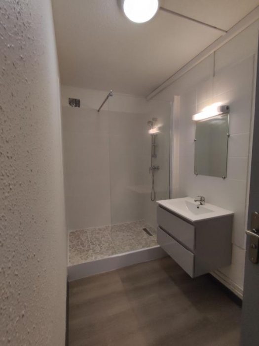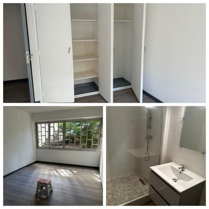 Appartement en rez-de-chaussé avec un emplacement de parking. Il comprend une terrasse couverte, 1 jardinet, 1 séjour, 1 cuisine semi-équipée, 1 couloir, 1 grande chambre avec placards, 1 salle d'eau avec wc.