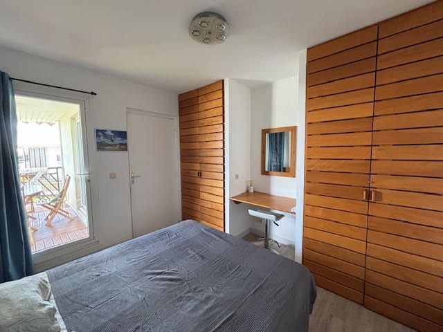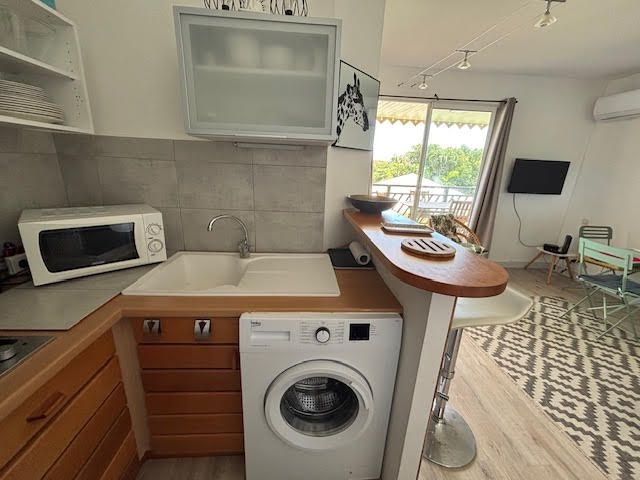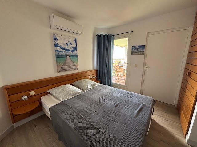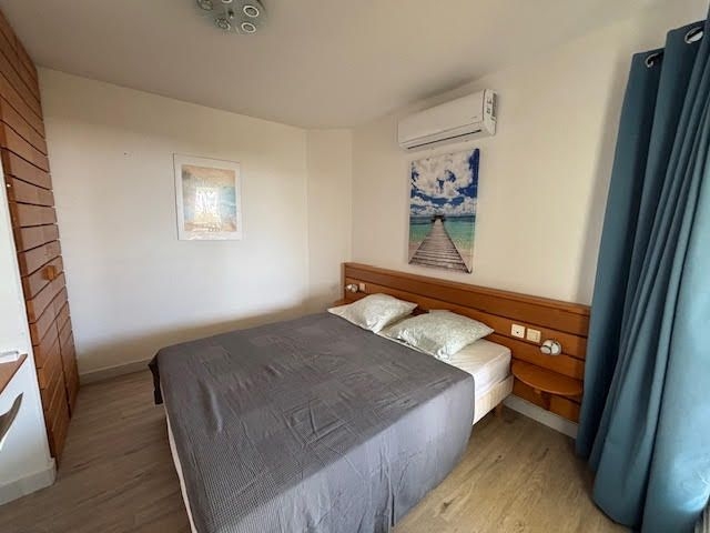 Il se compose d'une entrée avec placards, une pièce de vie climatisée avec son espace cuisine aménagée et équipée, une chambre climatisée avec placards, une petite chambre cabine climatisée avec lits superposés, un wc indépendant, une salle d'eau et un balcon couvert avec un aperçu mer.