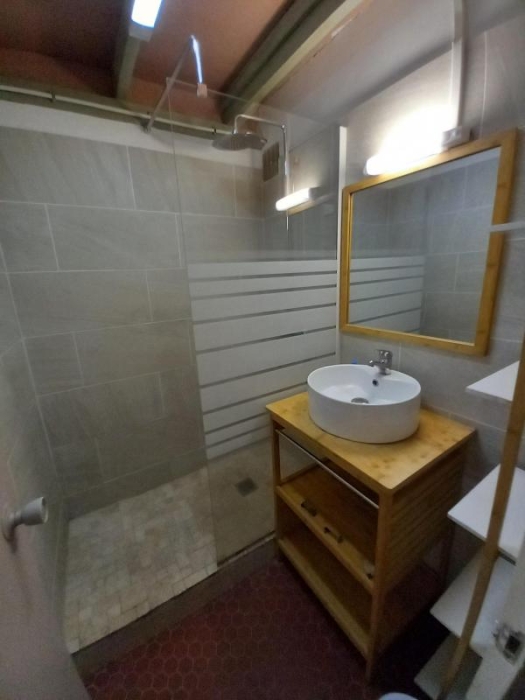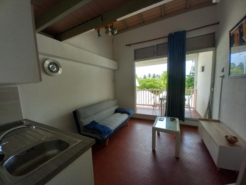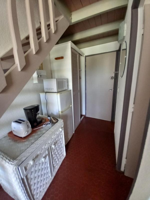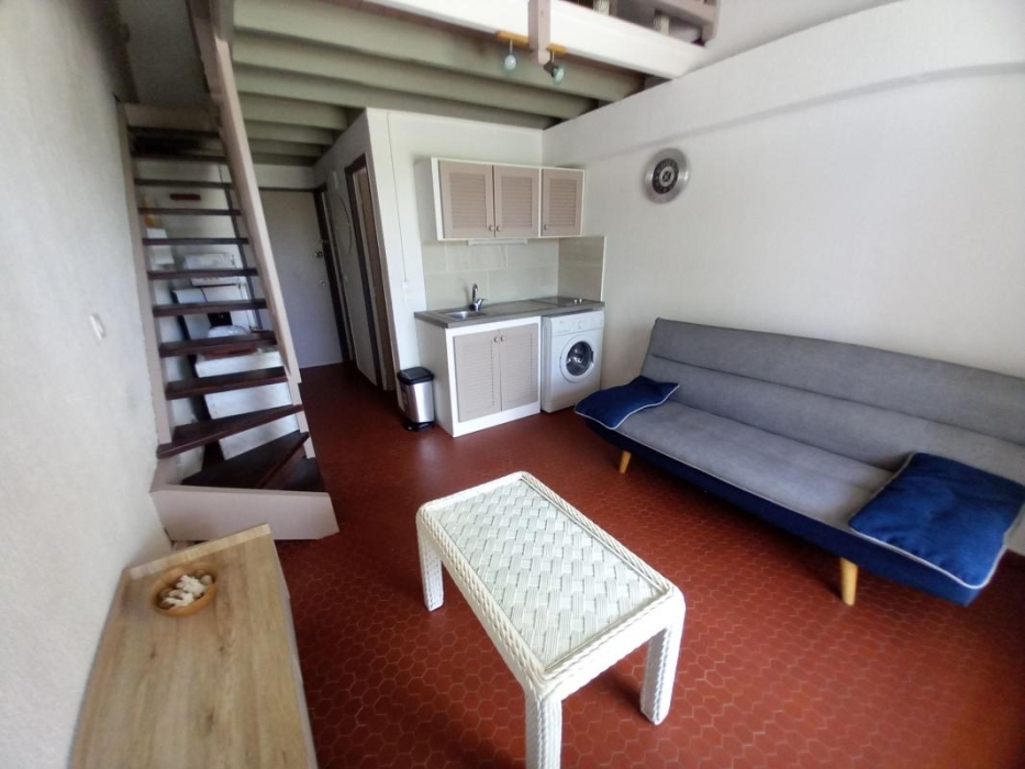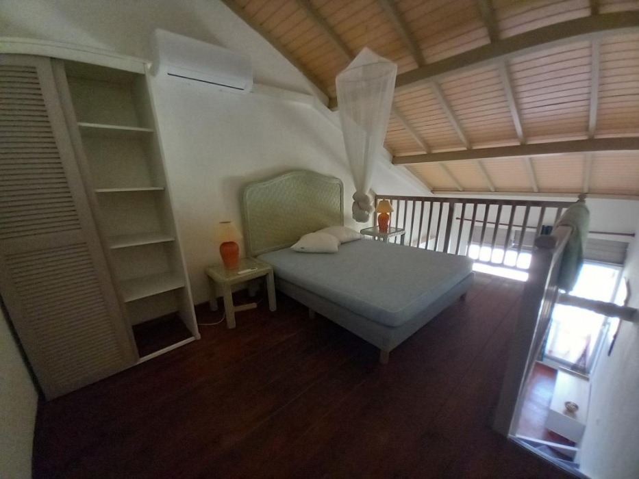 Au 1er étage, il est composé d'une entrée avec placard, une salle d'eau, wc indépendant, un séjour avec sa kitchenette aménagée et équipée. Une chambre climatisée en mezzanine ouverte et sa terrasse couverte.