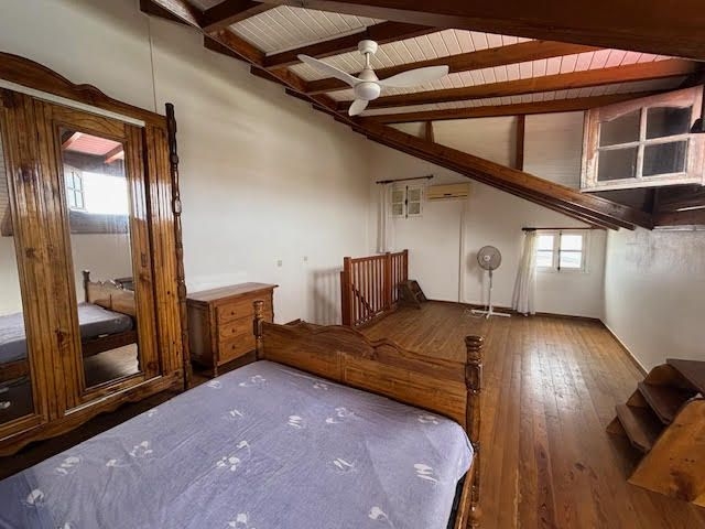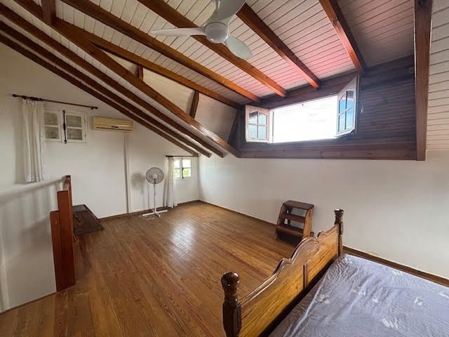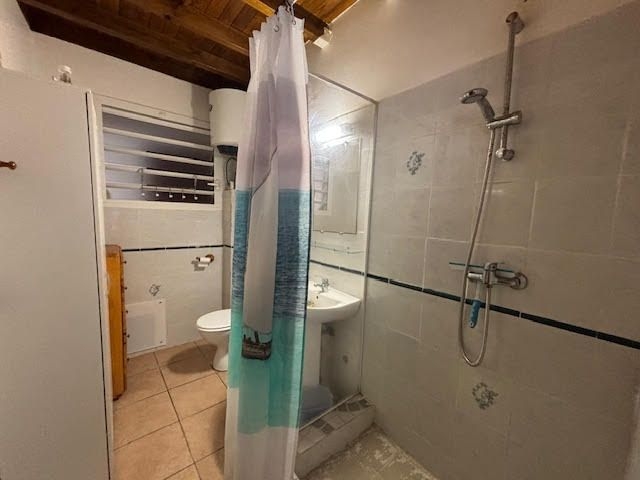 Il se compose d'une pièce de vie salon/séjour avec sa cuisine aménagée et équipée, une salle d'eau avec wc et une cour privative d'environ 20m². A l'étage une grande chambre climatisée d'environ 26m².