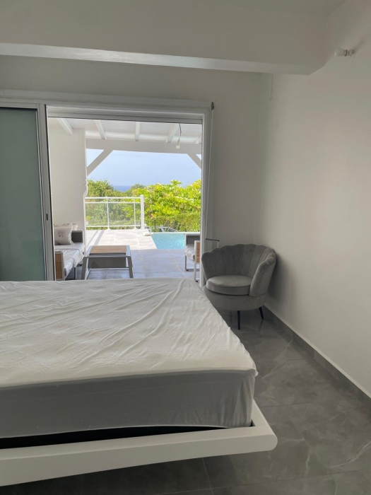 Dans un environnement calme et sans odeurs de sargasses, cette magnifique villa neuve offre tout le confort d'un lieu de résidence de standing meublé. Séjour confortable et cuisine américaine entièrement équipée (lave-vaisselle, fours, table de cuisson, réfrigérateur, vaisselle, placards...) avec un joli ilot central, un coin buanderie (lave-linge...), A cela s'ajoute une grande terrasse avec vue mer et vue sur la piscine. Les trois chambres jouissent aussi de la vue mer. Elles sont climatisées et dotées de leur propre salle d'eau. Le terrain de 800 m2, en dénivelé, offre deux places de parking. L'ensemble bénéficie d'un mobilier contemporain. Le portail est électrique. Pour le moment, ce bien est disponible...