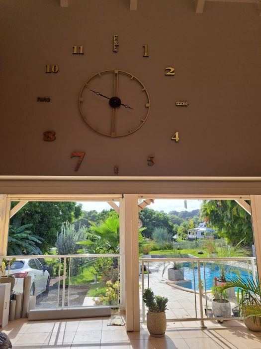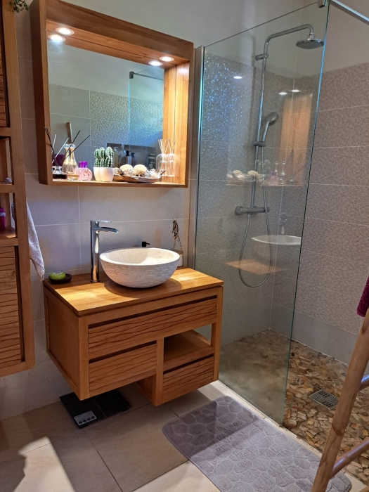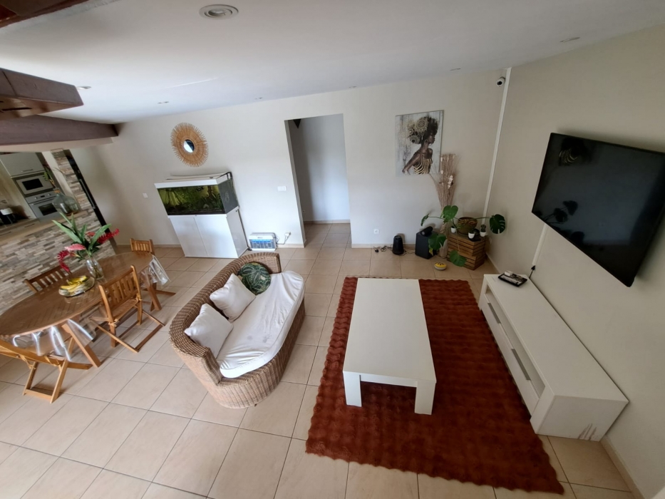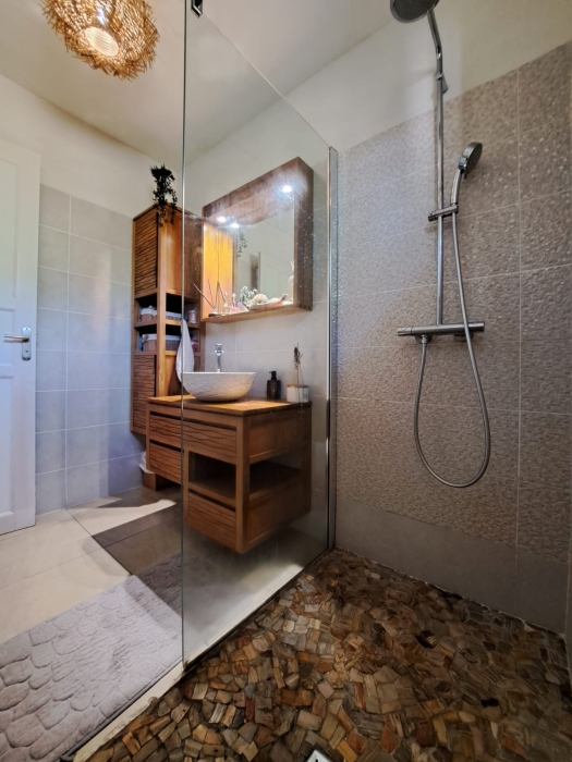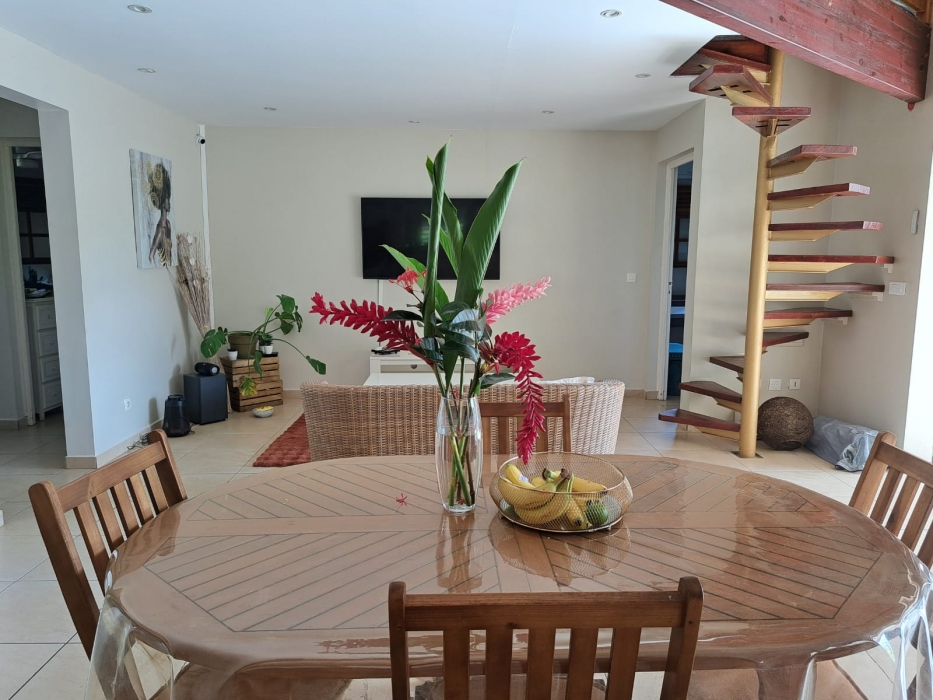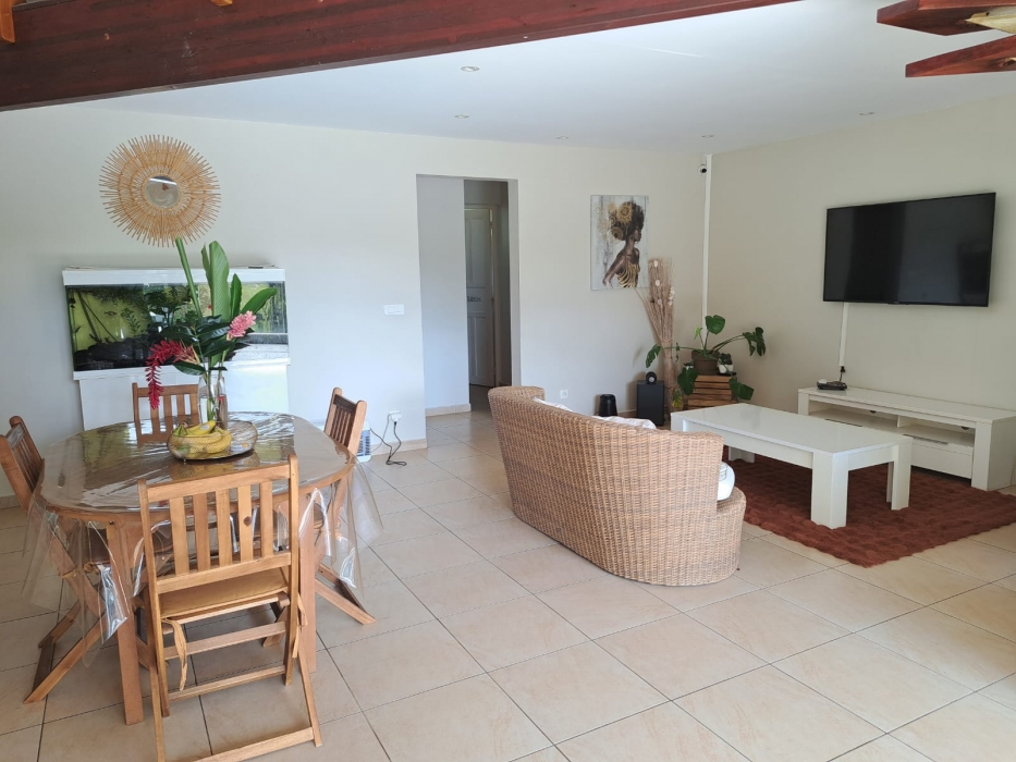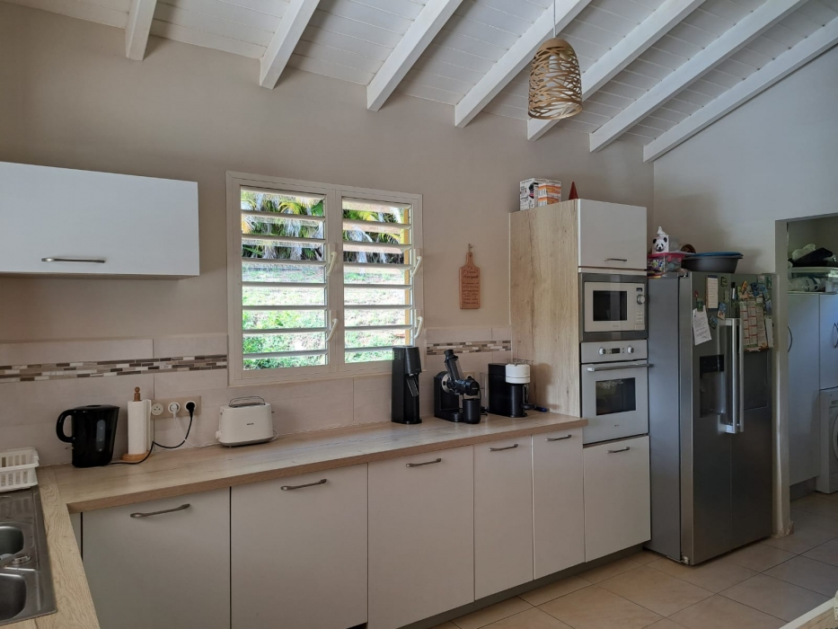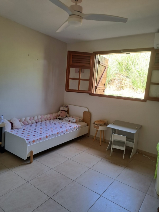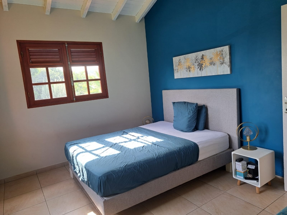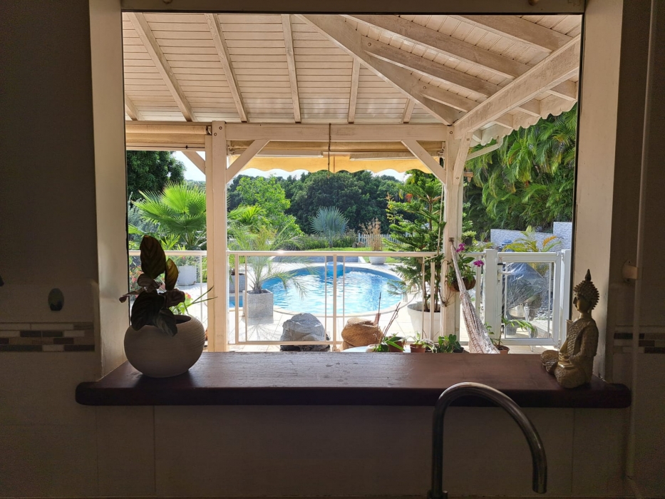BELLE VILLA MODERNE ET BIEN EQUIPEE, DE TYPE F5 MEUBLEE, EDIFIEE SUR UN TERRAIN ARBORE ET BIEN SITUEE A PETIT BOURG, SANS VIS-A-VIS DIRECT, AVEC PISCINE COMPRENANT UN SEJOUR CLIMATISE, UNE CUISINE EQUIPEE (réfrigérateur-congélateur, plaque de cuisson, four, hotte, micro-ondes, lave-vaisselle, lave-linge et sèche-linge), UN CELLIER, QUATRE CHAMBRES CLIMATISEES, DEUX SALLES D'EAU, UN WC INDEPENDANT, UN DRESSING, UNE TERRASSE, UNE PISCINE ET UN SALON EXTERIEUR ENTERRE.