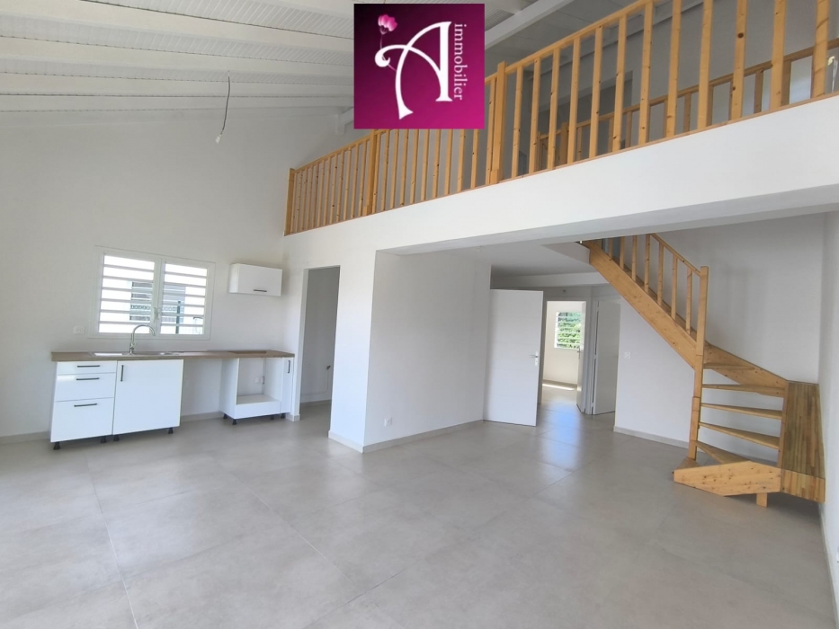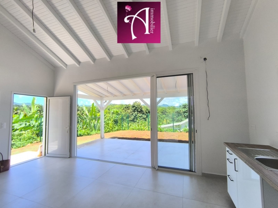 La maison se compose d'un séjour lumineux avec de grandes baies vitrées ouvrant sur la terrasse, ainsi que d'une cuisine semi-équipée avec meubles de rangement. Un cellier attenant vient compléter cet espace pratique et convivial.