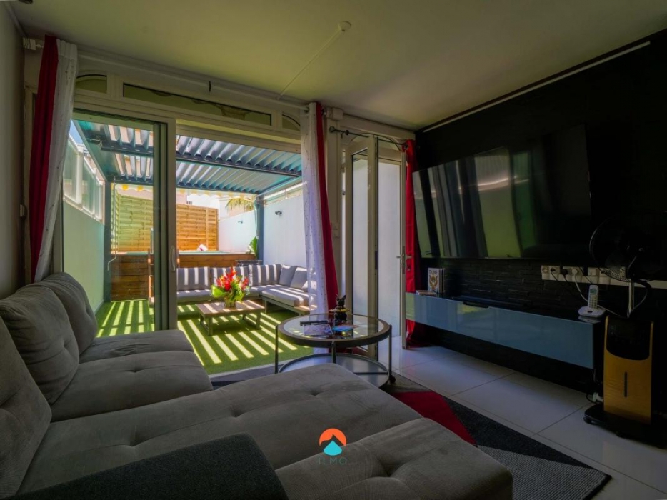 Elle se compose d'une entrée, d'une cuisine aménagée et entièrement équipée ouverte sur la grande pièce de vie salon/séjour climatisée.