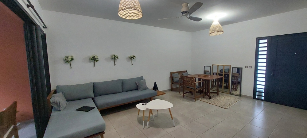 Maison louée en bail meublé d'1 an renouvelable, dispose au RDC d'un débarras extérieur juste avant la porte d'entrée, 1 séjour avec brasseur d'air donnant sur une terrasse et un jardinet sans vis à vis, une cuisine équipée, un wc/lave-mains; à l'étage, deux chambres avec placard et brasseurs d'air dont 1 climatisée, une salle de bains avec vasque et 1 coin wc, petite résidence calme et sécurisée avec portail automatique.
