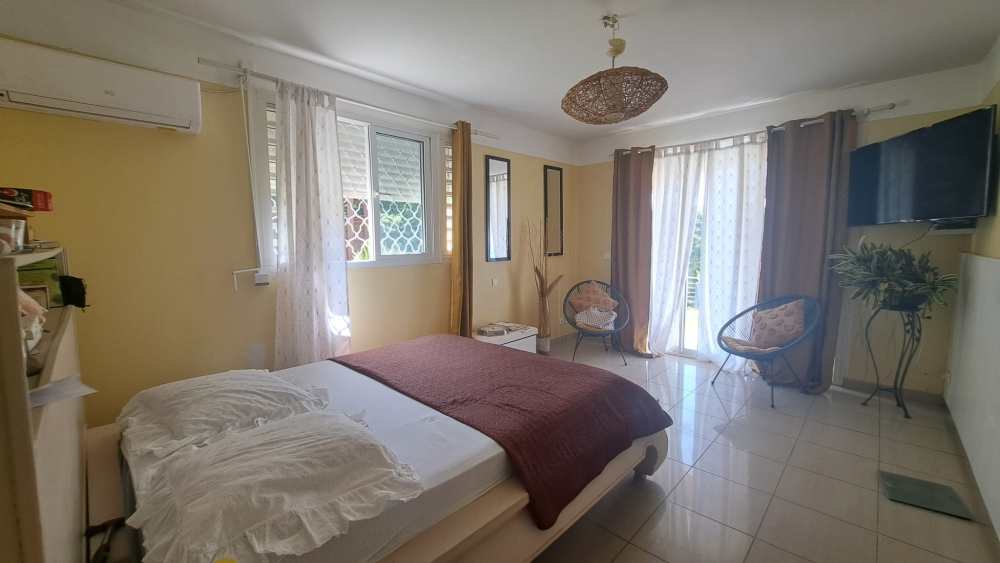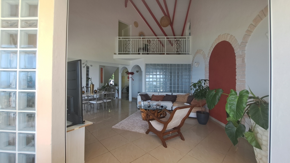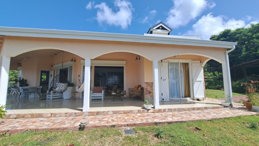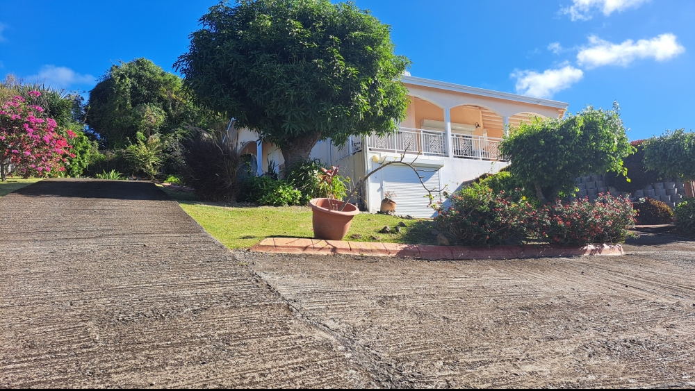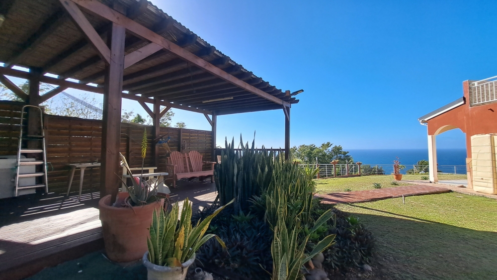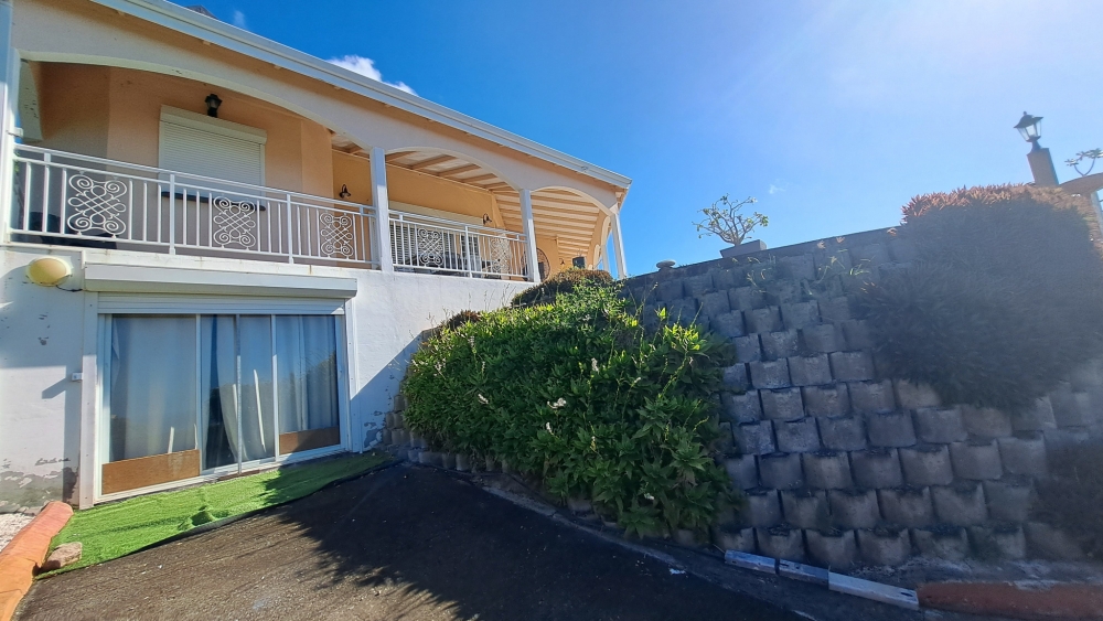 Découvrez cette superbe villa familiale répartie sur trois niveaux, offrant de très beaux volumes, avec un grand jardin entièrement clôturé et une vue mer dégagée sur l'archipel des Saintes. Cette villa comprend :