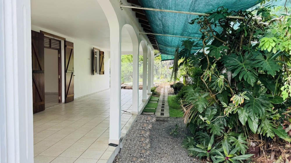 Avec sa grande terrasse en L dont une partie offre une jolie vue sur la mer et l'autre partie vue sur un parterre de plantes et un potager, cette maison offre également une grande cuisine équipée, un séjour, un couloir menant à une première chambre climatisée équipée d'un lavabo et d'une douche, à une seconde chambre équipée également d'un placard et d'une douche et à une troisième pièce à usage à déterminer équipée d'un WC séparé et d'un lavabo.