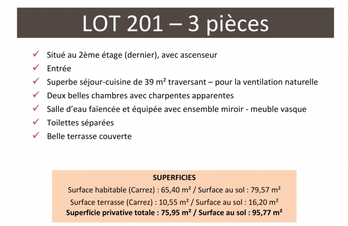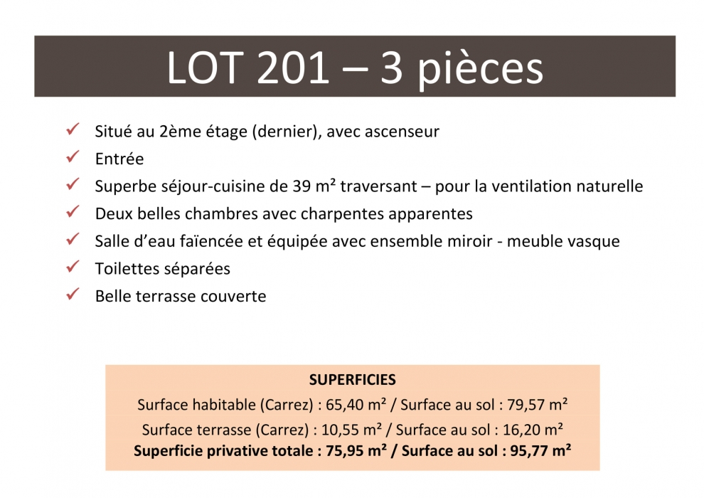 Conçu avec charpentes apparentes, cet appartement est doté d'un séjour-cuisine spacieux et traversant de 39 m2 pour le confort et la ventilation, de deux belles chambres, d'une salle d’eau moderne, de toilettes séparées et d'une terrasse couverte de 10,55 m2 (16,20 m2 au sol).
