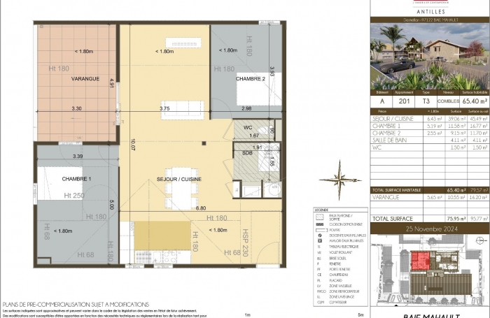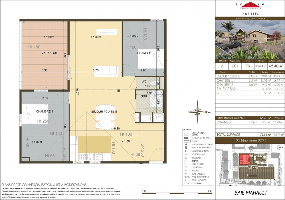 Niché dans un quartier résidentiel privé calme et accueillant; à deux pas de Jarry et de l'aéroport, ce logement neuf est disponible au prix de 287 000 € TTC pour une superficie totale de 75,95 m2 (95 m2 de surface au sol). Prix parking privé numéroté inclus.