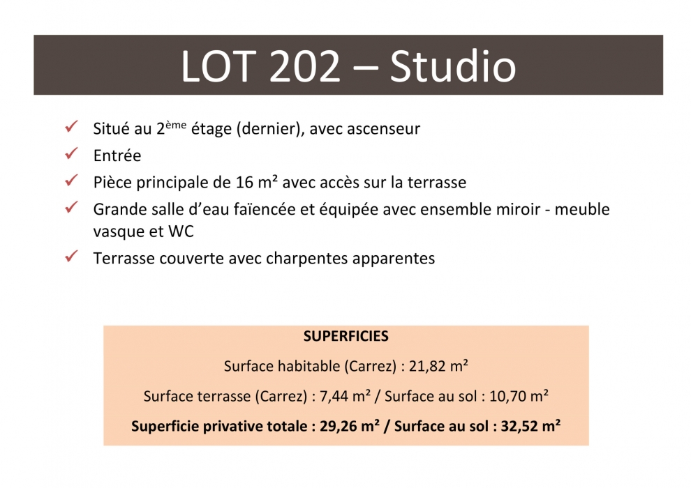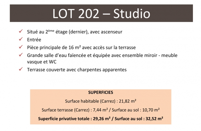 Cet appartement de 21,82 m2 habitable (carrez) auxquels s'ajoute la terrasse couverte de 7,44 m2 (10 m2 surface au sol) vous séduira par son élégance et ses finitions.