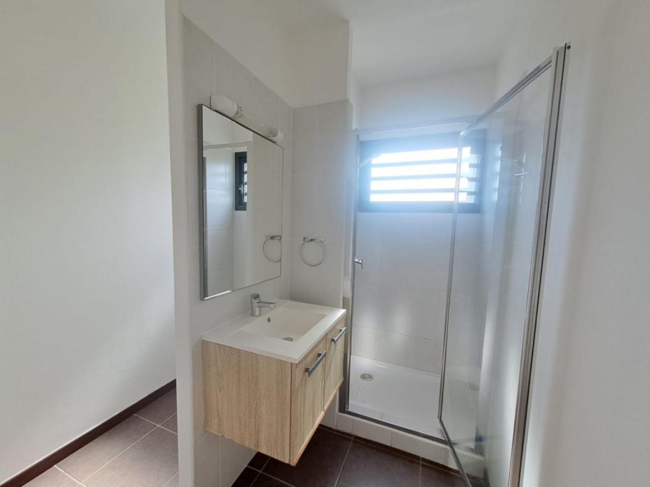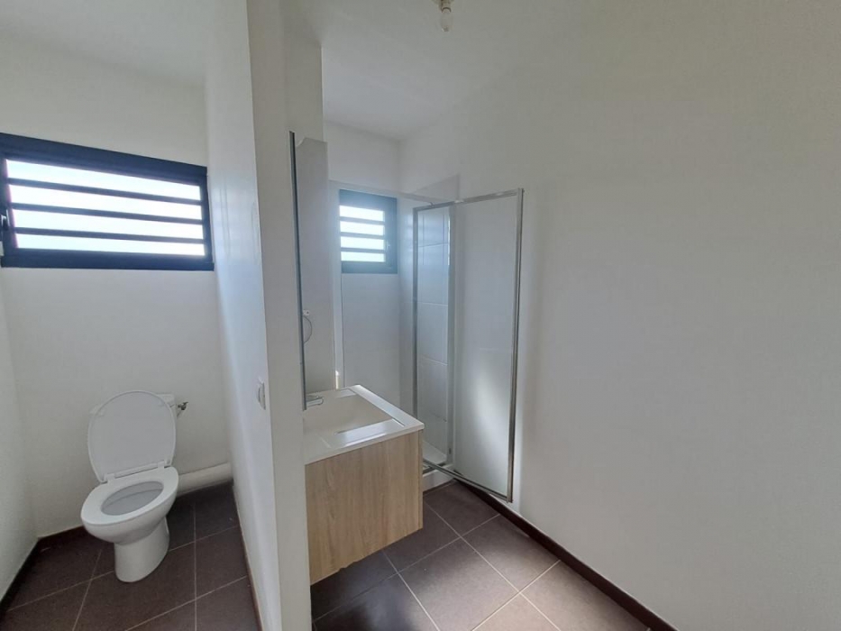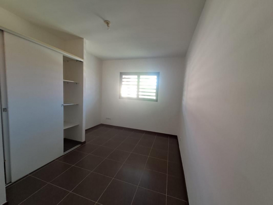L'appartement dispose d'une chambre climatisée avec rangements, ainsi que d'une salle d'eau fonctionnelle avec WC.