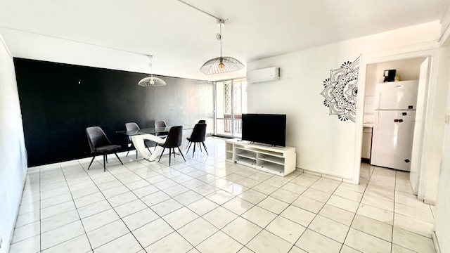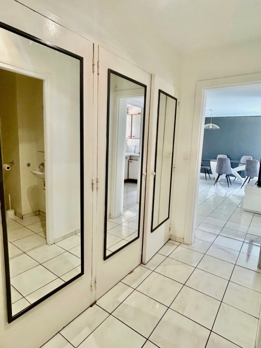 Appartement lumineux et bien agencé : Un séjour climatisé, une cuisine avec cellier, une entrée avec placard, ainsi qu’une salle de bains avec WC séparés.