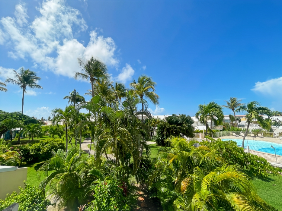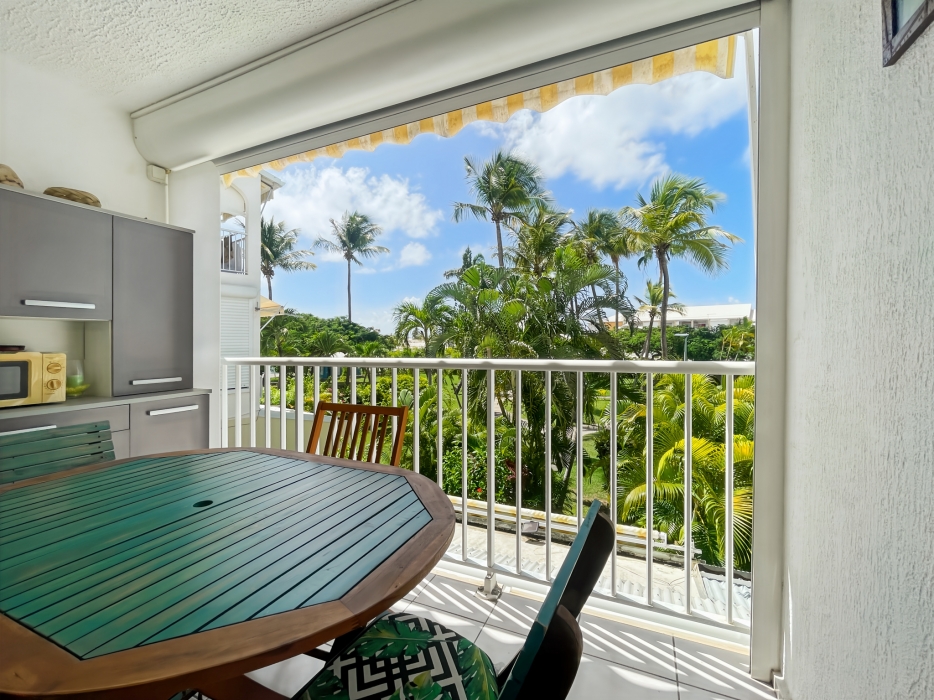 Le séjour s’ouvre sur une cuisine équipée, prolongé par une terrasse couverte bénéficiant d’une belle vue dégagée sur le parc et une des piscines de la résidence.