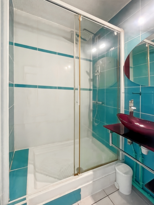 La salle d’eau est fonctionnelle et colorée avec sa grande douche à l'italienne.