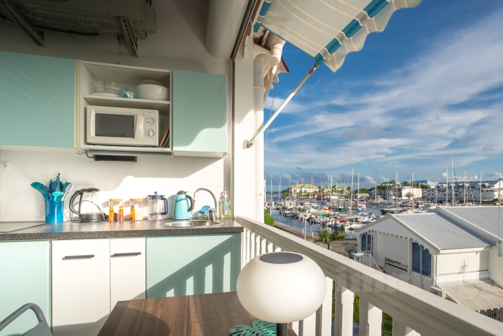 Cuisine : Moderne équipée et ouverte sur une terrasse avec une vue imprenable sur la Marina, la piscine et le jardin tropical.